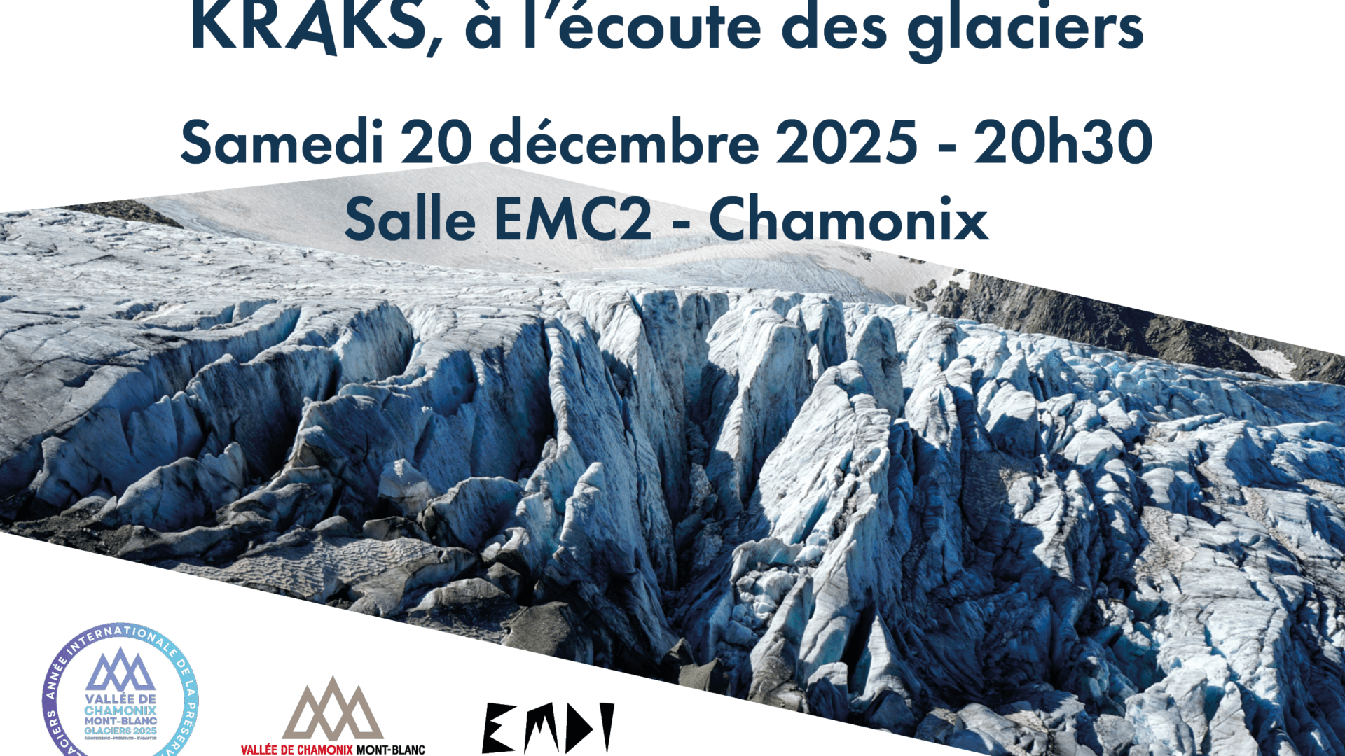 En conclusion de l’AnnĂ©e internationale de prĂ©servation des glaciers, nous vous donnons rendez-vous Ă  l'EMC2 le samedi 20 dĂ©cembre Ă  20h30, pour une soirĂ©e exceptionnelle.