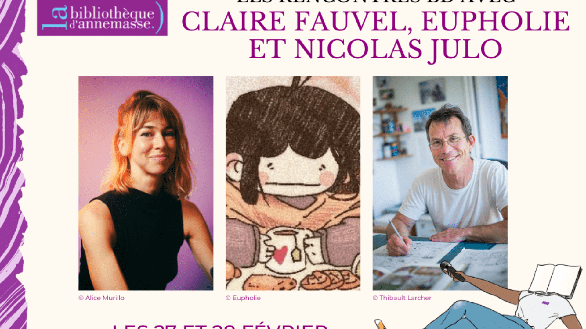 Les auteurs Claire Fauvel, Eupholie, et un Nicolas Julo, proposeront, vendredi 27 et 28 février, des ateliers à la bibliothèque Pierre Goy.